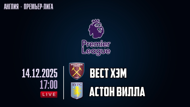 14 декабря 2025 года, мы предлагаем посмотреть онлайн трансляцию футбольного матча между футбольным клубом Вест Хэм и футбольным клубом Астон Вилла, проходящего в рамках Премьер лиги Англии.