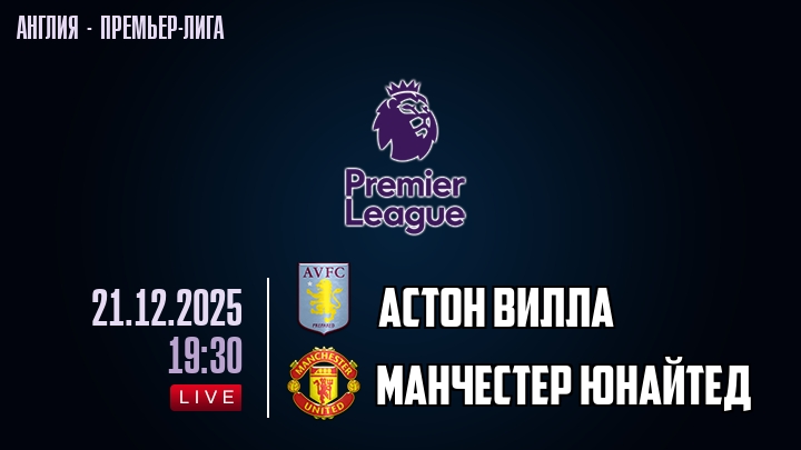 21 декабря 2025 года, мы предлагаем посмотреть онлайн трансляцию футбольного матча между футбольным клубом Астон Вилла и футбольным клубом Манчестер Юнайтед, проходящего в рамках Премьер лиги Англии.