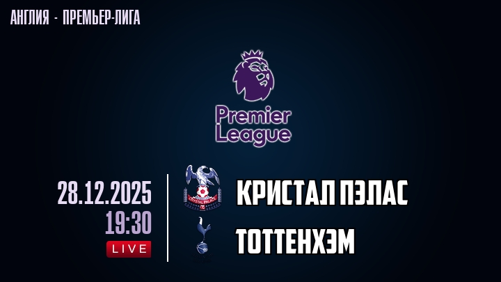 28 декабря 2025 года, мы предлагаем посмотреть онлайн трансляцию футбольного матча между футбольным клубом Кристал Пэлас и футбольным клубом Тоттенхэм, проходящего в рамках Премьер лиги Англии.