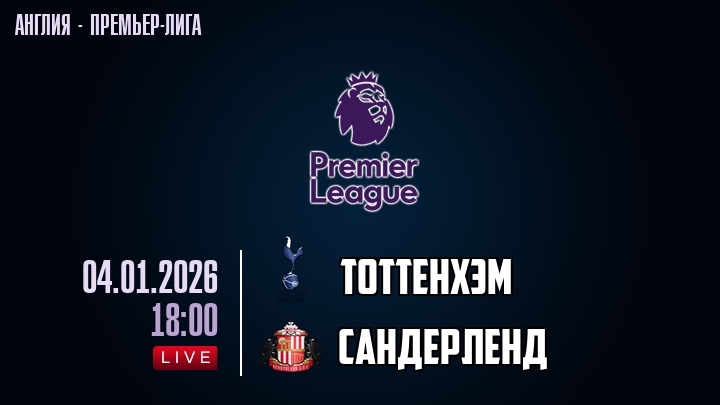 4 января 2026 года, состоялась онлайн трансляция футбольного матча между футбольным клубом Тоттенхэм и футбольным клубом Сандерленд, проходящего в рамках Премьер лиги Англии.
