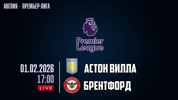 1 февраля 2026 года, мы предлагаем посмотреть онлайн трансляцию футбольного матча между футбольным клубом Астон Вилла и футбольным клубом Брентфорд, проходящего в рамках Премьер лиги Англии.