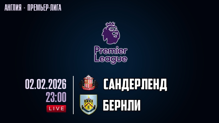 2 февраля 2026 года, мы предлагаем посмотреть онлайн трансляцию футбольного матча между футбольным клубом Сандерленд и футбольным клубом Бернли, проходящего в рамках Премьер лиги Англии.