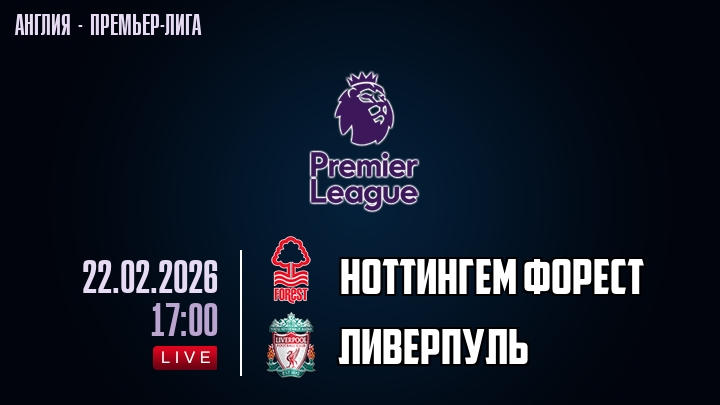 22 февраля 2026 года, мы предлагаем посмотреть онлайн трансляцию футбольного матча между футбольным клубом Ноттингем Форест и футбольным клубом Ливерпуль, проходящего в рамках Премьер лиги Англии.