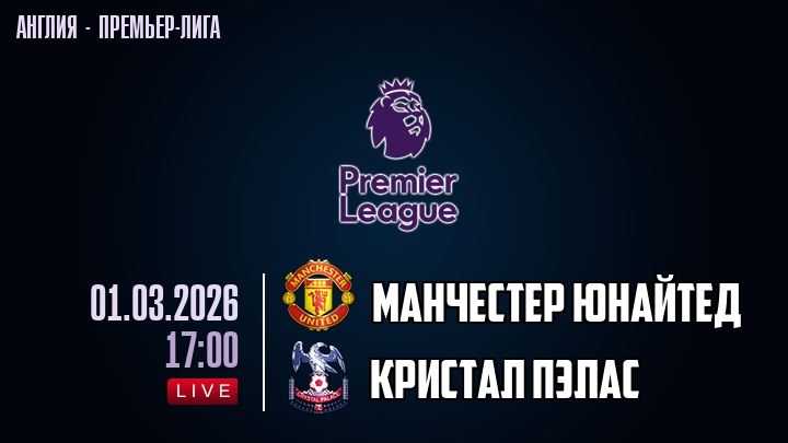 1 марта 2026 года, мы предлагаем посмотреть онлайн трансляцию футбольного матча между футбольным клубом Манчестер Юнайтед и футбольным клубом Кристал Пэлас, проходящего в рамках Премьер лиги Англии.