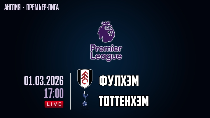 1 марта 2026 года, мы предлагаем посмотреть онлайн трансляцию футбольного матча между футбольным клубом Фулхэм и футбольным клубом Тоттенхэм, проходящего в рамках Премьер лиги Англии.