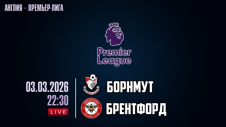 Сегодня, 3 марта 2026 года, мы предлагаем посмотреть онлайн трансляцию футбольного матча между футбольным клубом Борнмут и футбольным клубом Брентфорд, проходящего в рамках Премьер лиги Англии.