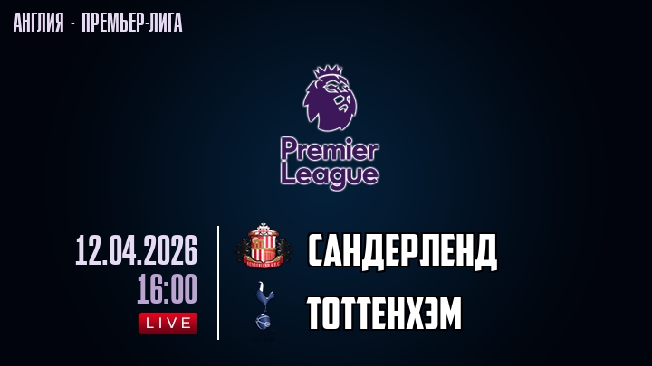 12 апреля 2026 года, мы предлагаем посмотреть онлайн трансляцию футбольного матча между футбольным клубом Сандерленд и футбольным клубом Тоттенхэм, проходящего в рамках Премьер лиги Англии.