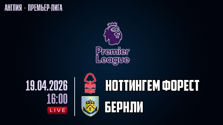 19 апреля 2026 года, мы предлагаем посмотреть онлайн трансляцию футбольного матча между футбольным клубом Ноттингем Форест и футбольным клубом Бернли, проходящего в рамках Премьер лиги Англии.
