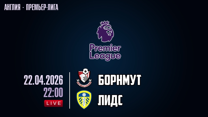 22 апреля 2026 года, мы предлагаем посмотреть онлайн трансляцию футбольного матча между футбольным клубом Борнмут и футбольным клубом Лидс, проходящего в рамках Премьер лиги Англии.