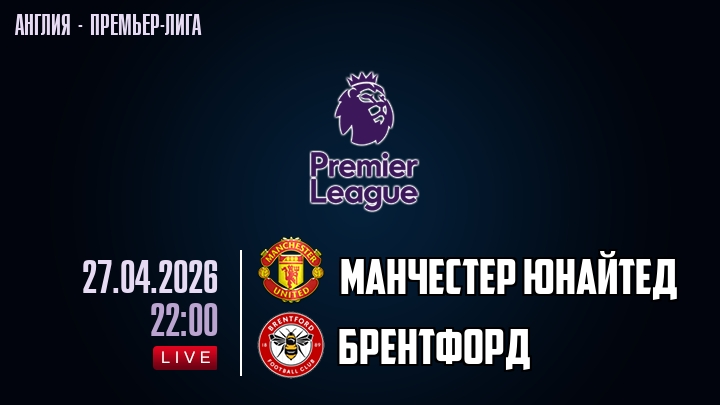 27 апреля 2026 года, мы предлагаем посмотреть онлайн трансляцию футбольного матча между футбольным клубом Манчестер Юнайтед и футбольным клубом Брентфорд, проходящего в рамках Премьер лиги Англии.
