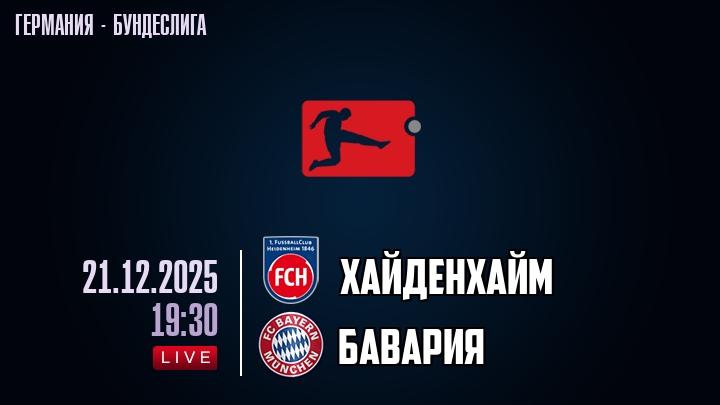 21 декабря 2025 года, мы предлагаем посмотреть онлайн трансляцию футбольного матча между футбольным клубом Хайденхайм и футбольным клубом Бавария, проходящего в рамках Бундеслиги Германии.