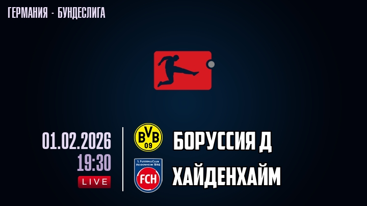 1 февраля 2026 года, мы предлагаем посмотреть онлайн трансляцию футбольного матча между футбольным клубом Боруссия Д и футбольным клубом Хайденхайм, проходящего в рамках Бундеслиги Германии.