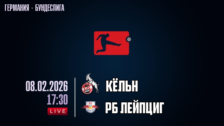 8 февраля 2026 года, мы предлагаем посмотреть онлайн трансляцию футбольного матча между футбольным клубом Кльн и футбольным клубом РБ Лейпциг, проходящего в рамках Бундеслиги Германии.
