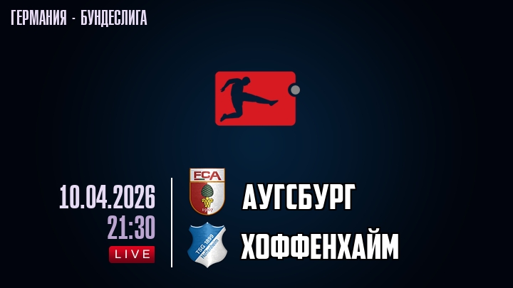10 апреля 2026 года, мы предлагаем посмотреть онлайн трансляцию футбольного матча между футбольным клубом Аугсбург и футбольным клубом Хоффенхайм, проходящего в рамках Бундеслиги Германии.