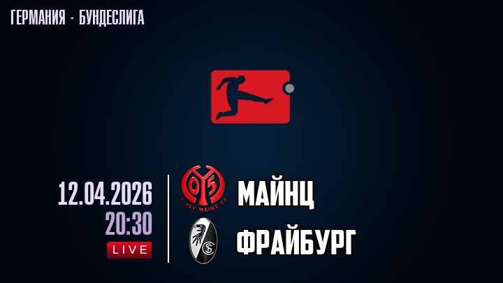 12 апреля 2026 года, мы предлагаем посмотреть онлайн трансляцию футбольного матча между футбольным клубом Майнц и футбольным клубом Фрайбург, проходящего в рамках Бундеслиги Германии.