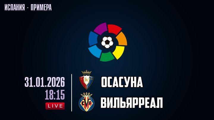Сегодня, 31 января 2026 года, мы предлагаем посмотреть онлайн трансляцию футбольного матча между футбольным клубом Осасуна и футбольным клубом Вильярреал, проходящего в рамках чемпионата Испании.