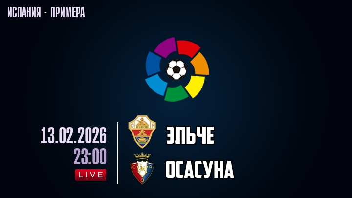 13 февраля 2026 года, мы предлагаем посмотреть онлайн трансляцию футбольного матча между футбольным клубом Эльче и футбольным клубом Осасуна, проходящего в рамках чемпионата Испании.