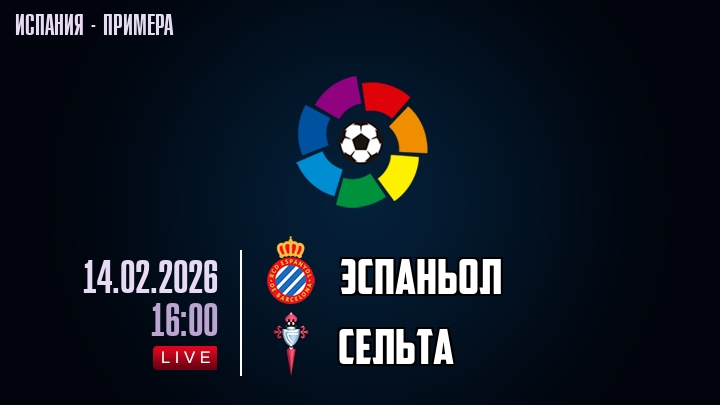 14 февраля 2026 года, мы предлагаем посмотреть онлайн трансляцию футбольного матча между футбольным клубом Эспаньол и футбольным клубом Сельта, проходящего в рамках чемпионата Испании.