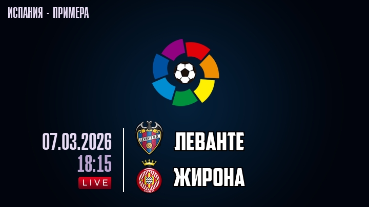 7 марта 2026 года, мы предлагаем посмотреть онлайн трансляцию футбольного матча между футбольным клубом Леванте и футбольным клубом Жирона, проходящего в рамках чемпионата Испании.