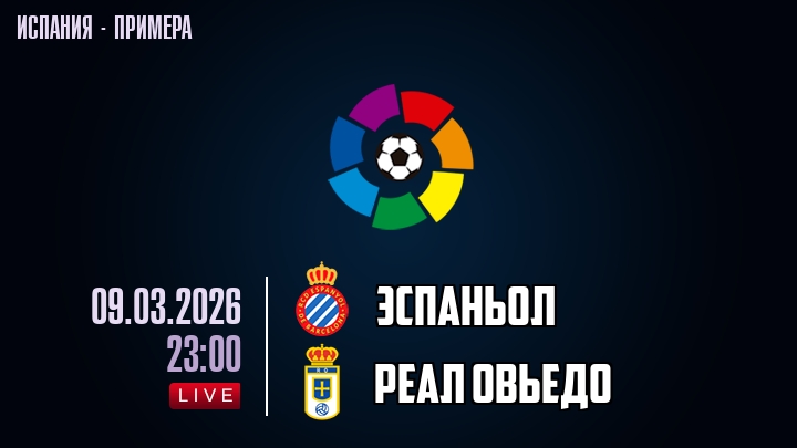 9 марта 2026 года, мы предлагаем посмотреть онлайн трансляцию футбольного матча между футбольным клубом Эспаньол и футбольным клубом Реал Овьедо, проходящего в рамках чемпионата Испании.