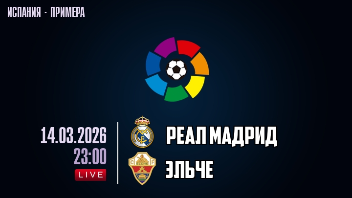 14 марта 2026 года, мы предлагаем посмотреть онлайн трансляцию футбольного матча между футбольным клубом Реал Мадрид и футбольным клубом Эльче, проходящего в рамках чемпионата Испании.