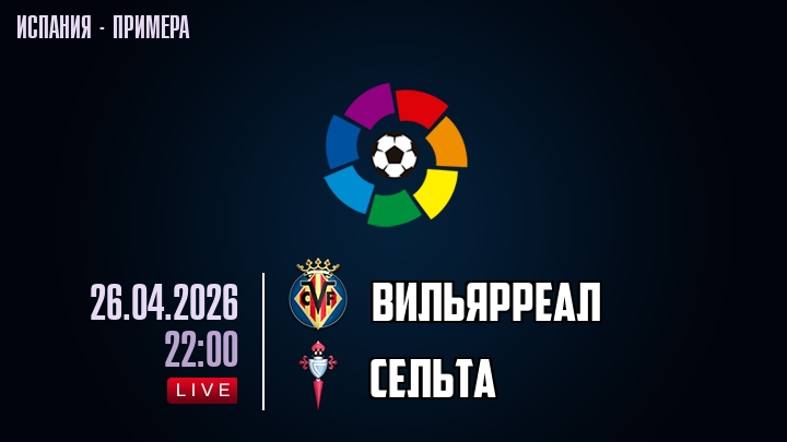 26 апреля 2026 года, мы предлагаем посмотреть онлайн трансляцию футбольного матча между футбольным клубом Вильярреал и футбольным клубом Сельта, проходящего в рамках чемпионата Испании.