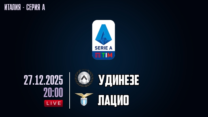 27 декабря 2025 года, мы предлагаем посмотреть онлайн трансляцию футбольного матча между футбольным клубом Удинезе и футбольным клубом Лацио, проходящего в рамках Серии А чемпионата Италии.