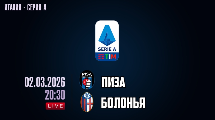 2 марта 2026 года, мы предлагаем посмотреть онлайн трансляцию футбольного матча между футбольным клубом Пиза и футбольным клубом Болонья, проходящего в рамках Серии А чемпионата Италии.