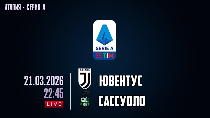 21 марта 2026 года, мы предлагаем посмотреть онлайн трансляцию футбольного матча между футбольным клубом Ювентус и футбольным клубом Сассуоло, проходящего в рамках Серии А чемпионата Италии.