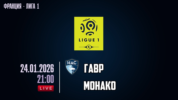 24 января 2026 года, мы предлагаем посмотреть онлайн трансляцию футбольного матча между футбольным клубом Гавр и футбольным клубом Монако, проходящего в рамках Лиги 1 чемпионата Франция.
