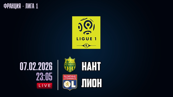 7 февраля 2026 года, мы предлагаем посмотреть онлайн трансляцию футбольного матча между футбольным клубом Нант и футбольным клубом Лион, проходящего в рамках Лиги 1 чемпионата Франция.