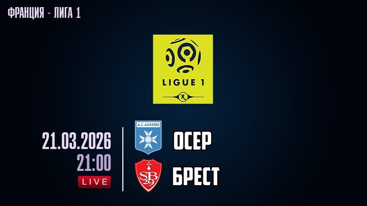 21 марта 2026 года, мы предлагаем посмотреть онлайн трансляцию футбольного матча между футбольным клубом Осер и футбольным клубом Брест, проходящего в рамках Лиги 1 чемпионата Франция.