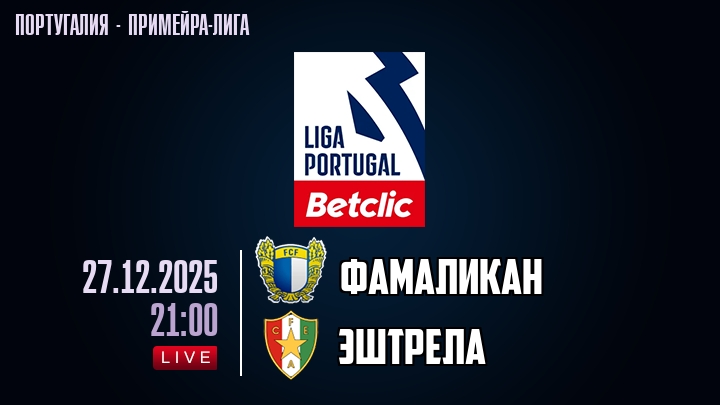 27 декабря 2025 года, мы предлагаем посмотреть онлайн трансляцию футбольного матча между футбольным клубом Фамаликан и футбольным клубом Эштрела, проходящего в рамках Примейра-лиги Португалии.