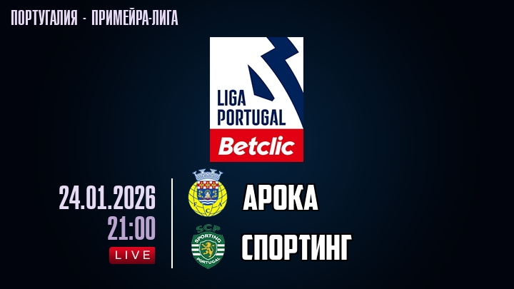 24 января 2026 года, мы предлагаем посмотреть онлайн трансляцию футбольного матча между футбольным клубом Арока и футбольным клубом Спортинг, проходящего в рамках Примейра-лиги Португалии.