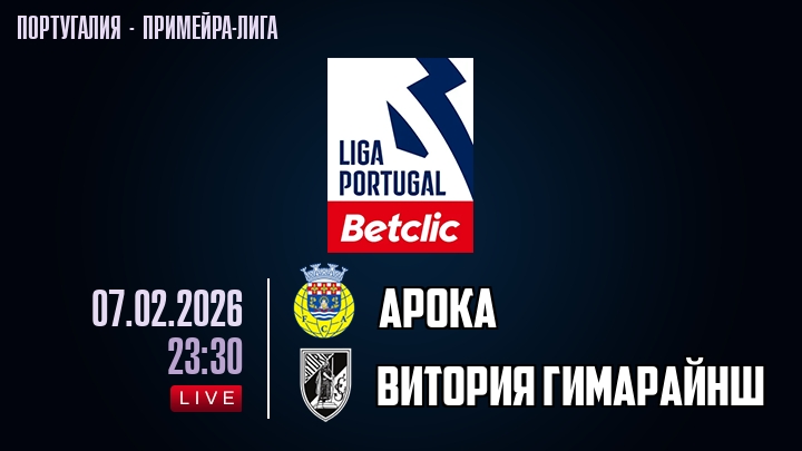 7 февраля 2026 года, мы предлагаем посмотреть онлайн трансляцию футбольного матча между футбольным клубом Арока и футбольным клубом Витория Гимарайнш, проходящего в рамках Примейра-лиги Португалии.