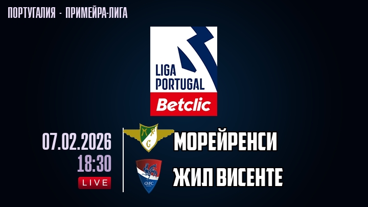 7 февраля 2026 года, мы предлагаем посмотреть онлайн трансляцию футбольного матча между футбольным клубом Морейренси и футбольным клубом Жил Висенте, проходящего в рамках Примейра-лиги Португалии.