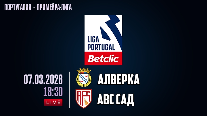 7 марта 2026 года, мы предлагаем посмотреть онлайн трансляцию футбольного матча между футбольным клубом Алверка и футбольным клубом АВС САД, проходящего в рамках Примейра-лиги Португалии.