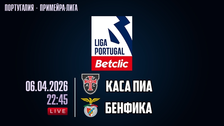 6 апреля 2026 года, мы предлагаем посмотреть онлайн трансляцию футбольного матча между футбольным клубом Каса Пиа и футбольным клубом Бенфика, проходящего в рамках Примейра-лиги Португалии.