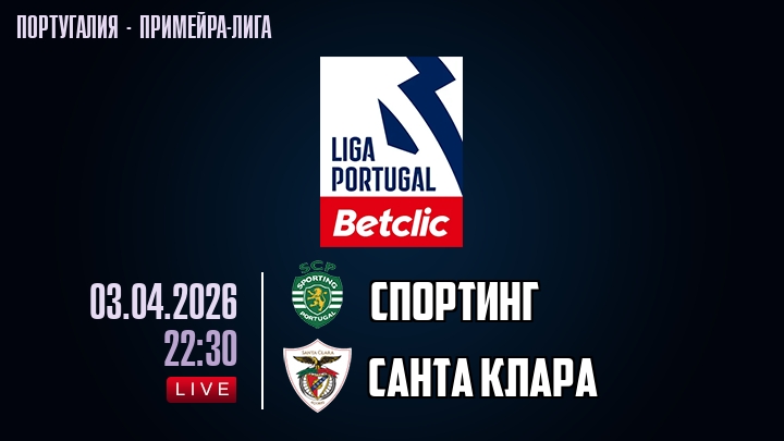 3 апреля 2026 года, мы предлагаем посмотреть онлайн трансляцию футбольного матча между футбольным клубом Спортинг и футбольным клубом Санта Клара, проходящего в рамках Примейра-лиги Португалии.