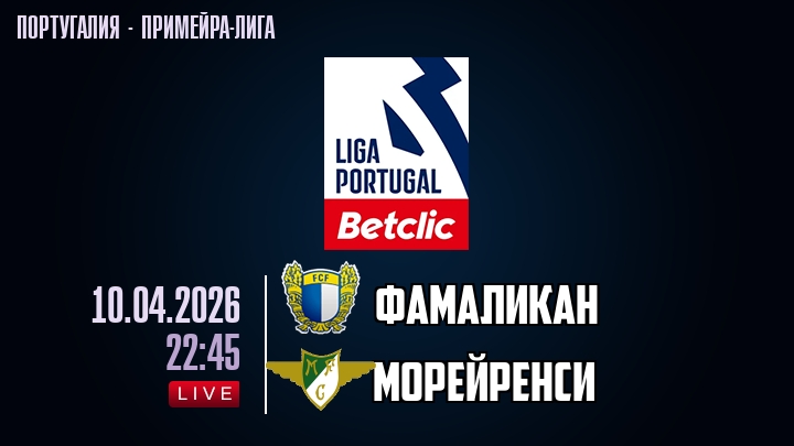 10 апреля 2026 года, мы предлагаем посмотреть онлайн трансляцию футбольного матча между футбольным клубом Фамаликан и футбольным клубом Морейренси, проходящего в рамках Примейра-лиги Португалии.