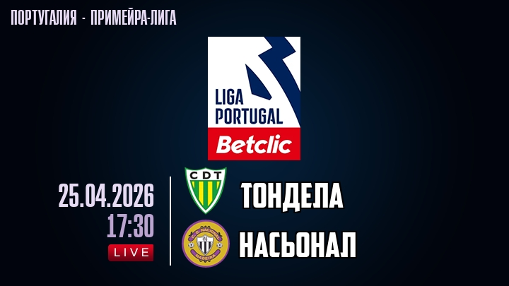 Сегодня, 25 апреля 2026 года, мы предлагаем посмотреть онлайн трансляцию футбольного матча между футбольным клубом Тондела и футбольным клубом Насьонал, проходящего в рамках Примейра-лиги Португалии.
