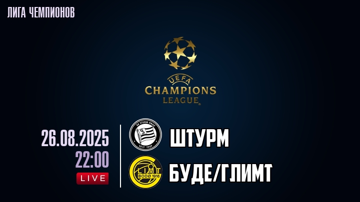 26 августа 2025 года, состоялась онлайн трансляция футбольного матча между футбольным клубом Штурм и футбольным клубом БудеГлимт, проходящего в рамках Лиги Чемпионов.