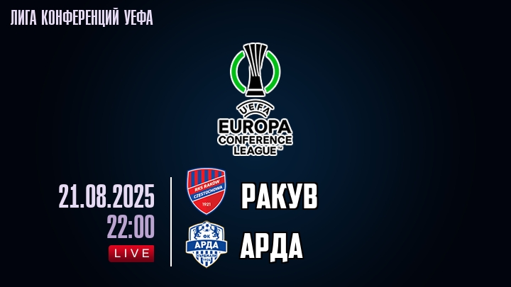 21 августа 2025 года, состоялась онлайн трансляция футбольного матча между футбольным клубом Ракув и футбольным клубом Арда, проходящего в рамках Лиги конференций УЕФА.
