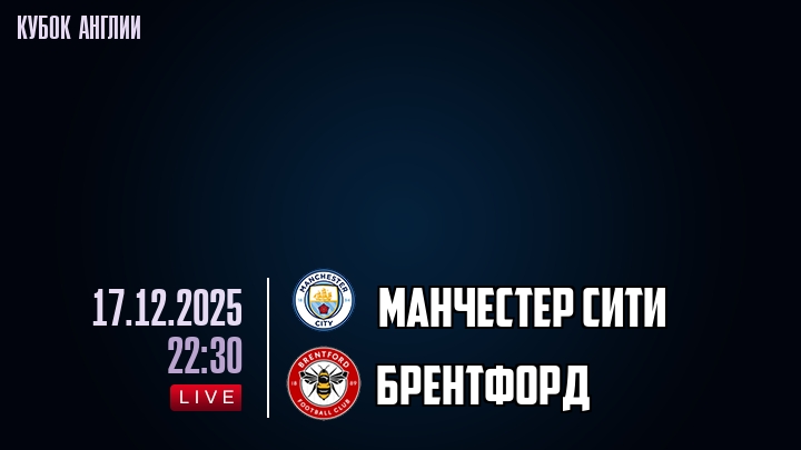 17 декабря 2025 года, мы предлагаем посмотреть онлайн трансляцию футбольного матча между футбольным клубом Манчестер Сити и футбольным клубом Брентфорд, проходящего в рамках Кубка Англии.