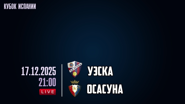 17 декабря 2025 года, мы предлагаем посмотреть онлайн трансляцию футбольного матча между футбольным клубом Уэска и футбольным клубом Осасуна, проходящего в рамках Кубка Испании.