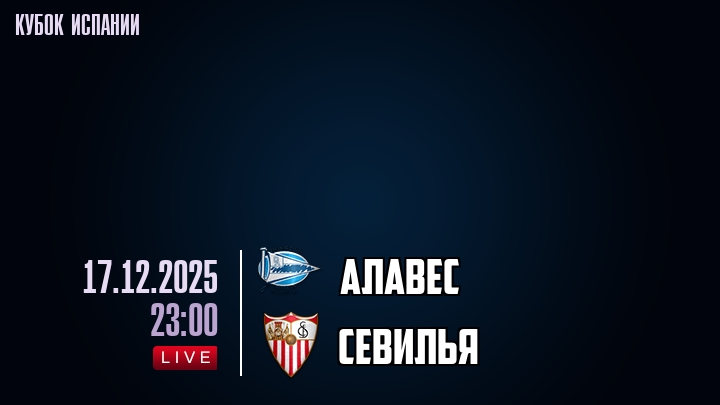 17 декабря 2025 года, мы предлагаем посмотреть онлайн трансляцию футбольного матча между футбольным клубом Алавес и футбольным клубом Севилья, проходящего в рамках Кубка Испании.