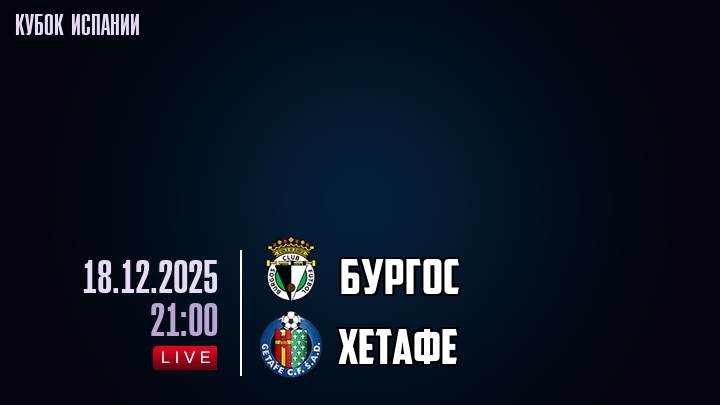 Сегодня, 18 декабря 2025 года, мы предлагаем посмотреть онлайн трансляцию футбольного матча между футбольным клубом Бургос и футбольным клубом Хетафе, проходящего в рамках Кубка Испании.