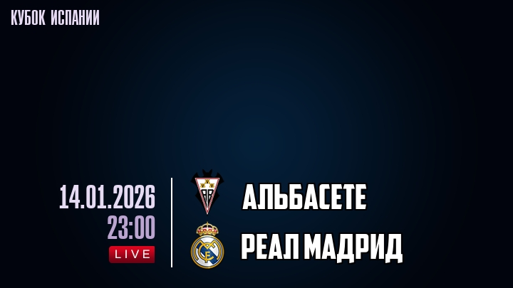 14 января 2026 года, мы предлагаем посмотреть онлайн трансляцию футбольного матча между футбольным клубом Альбасете и футбольным клубом Реал Мадрид, проходящего в рамках Кубка Испании.
