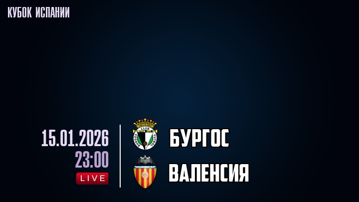15 января 2026 года, мы предлагаем посмотреть онлайн трансляцию футбольного матча между футбольным клубом Бургос и футбольным клубом Валенсия, проходящего в рамках Кубка Испании.