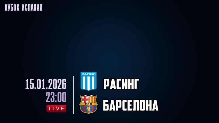 15 января 2026 года, мы предлагаем посмотреть онлайн трансляцию футбольного матча между футбольным клубом Расинг и футбольным клубом Барселона, проходящего в рамках Кубка Испании.